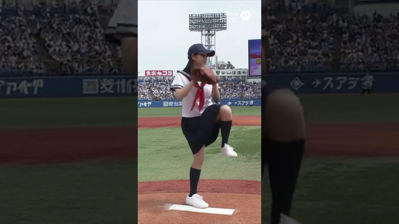 日本の女子高校生が野球の試合で始球式を行い、捕手に向かってボールを投げる。