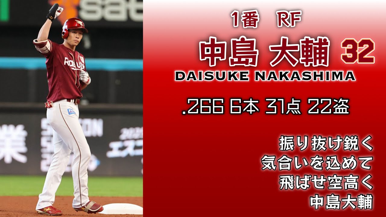 中島-村林-黒川-ボイト-浅村-宗山-渡邊佳明-堀内-辰己-投手(古謝-岸-藤井-ハワード)-太田-石原-小深田-鈴木大-外国人(フランコ-ゴンザレス)-小郷-伊藤裕-阿部-武藤-岡島