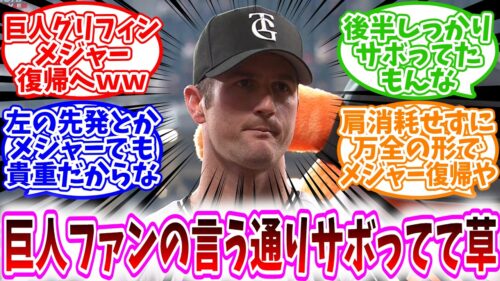 【読売ジャイアンツ反応集】「巨人・グリフィン、メジャー復帰へww」に対する、野球民の反応集/巨人ファンの言う通りサボってて草/後半しっかりサボってたもんな/肩消耗せずに万全の形でメジャー復帰や