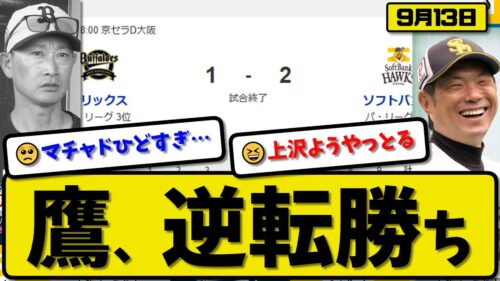 【パ1位vs3位】ソフトバンクホークスがオリックスバファローズに2-1で勝利…9月13日逆転勝ち…先発上沢7回無失点…牧原が活躍【最新・反応集・なんJ・2ch】プロ野球