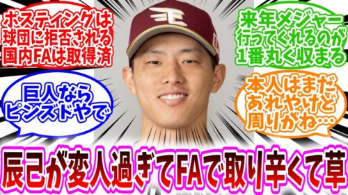 楽天 【楽天イーグルス反応集】「楽天・辰己が変人のせいでFAでの獲得に手を出しづらそうで草」に対する、野球民の反応集/来年メジャーが1番丸く収まる/巨人ならピンズドやで/本人はまだあれやけど周りがね…