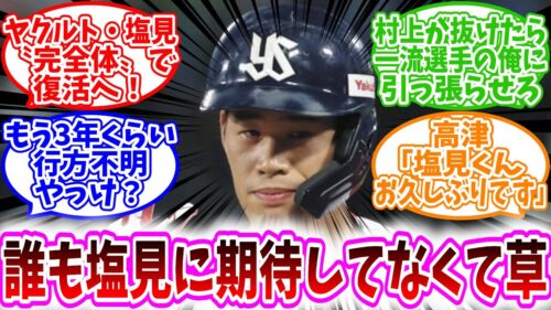 ヤクルト 【スワローズ反応集】「ヤクルト・塩見に誰も期待してなくて草」に対する、野球民の反応集/ヤクルト・塩見〝完全体〟で復活へ!/もう3年くらい行方不明やっけ?/高津「塩見くんお久しぶりです」