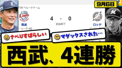 【パ5位vs6位】西武ライオンズがロッテマリーンズに4-0で勝利…9月6日4連勝…先発渡邉9回無失点…西川が全打点の活躍【最新・反応集・なんJ・2ch】プロ野球